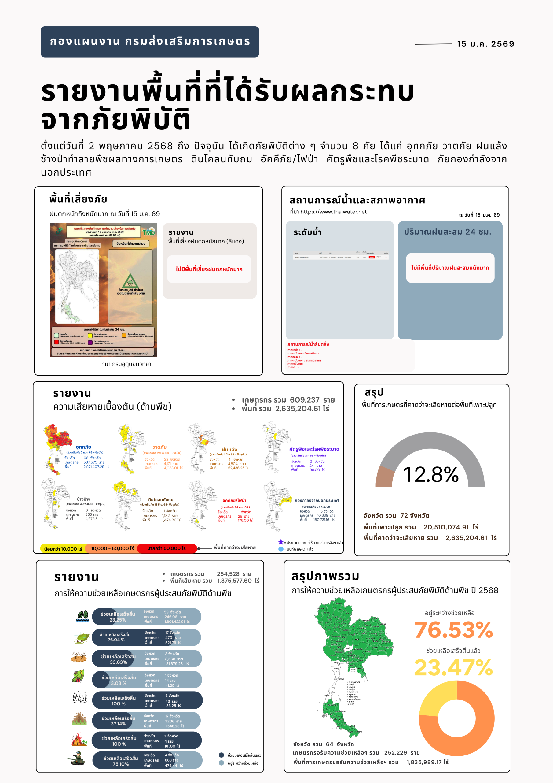 16 มกราคม 2569 พยากรณ์อากาศ 24 ชั่วโมงข้างหน้า ประเทศไทยมีอุณหภูมิสูงขึ้น 1-2 องศาเซลเซียส กับมีหมอกในตอนเช้า และมีหมอกหนาบางพื้นที่ แต่ยังคงมีอากาศเย็นถึงหนาวในภาคเหนือ และภาคตะวันออกเฉียงเหนือ เนื่องจากบริเวณความกดอากาศสูงหรือมวลอากาศเย็นที่ปกคลุมประเทศไทยตอนบนมีกำลังอ่อนลง ในขณะที่คลื่นกระแสลมฝ่ายตะวันตกจากประเทศเมียนมาจะเคลื่อนเข้าปกคลุมภาคเหนือ ประกอบกับมีลมตะวันออกเฉียงใต้พัดนำความชื้นเข้ามาปกคลุมภาคตะวันออก ทำให้บริเวณดังกล่าวมีฝนเล็กน้อยบางแห่ง ขอให้ประชาชนดูแลรักษาสุขภาพเนื่องจากสภาพอากาศที่เปลี่ยนแปลง และเพิ่มความระมัดระวังในการสัญจรผ่านบริเวณที่มีหมอก รวมทั้งระวังอันตรายจากอัคคีภัยเนื่องจากสภาพอากาศแห้งไว้ด้วย
