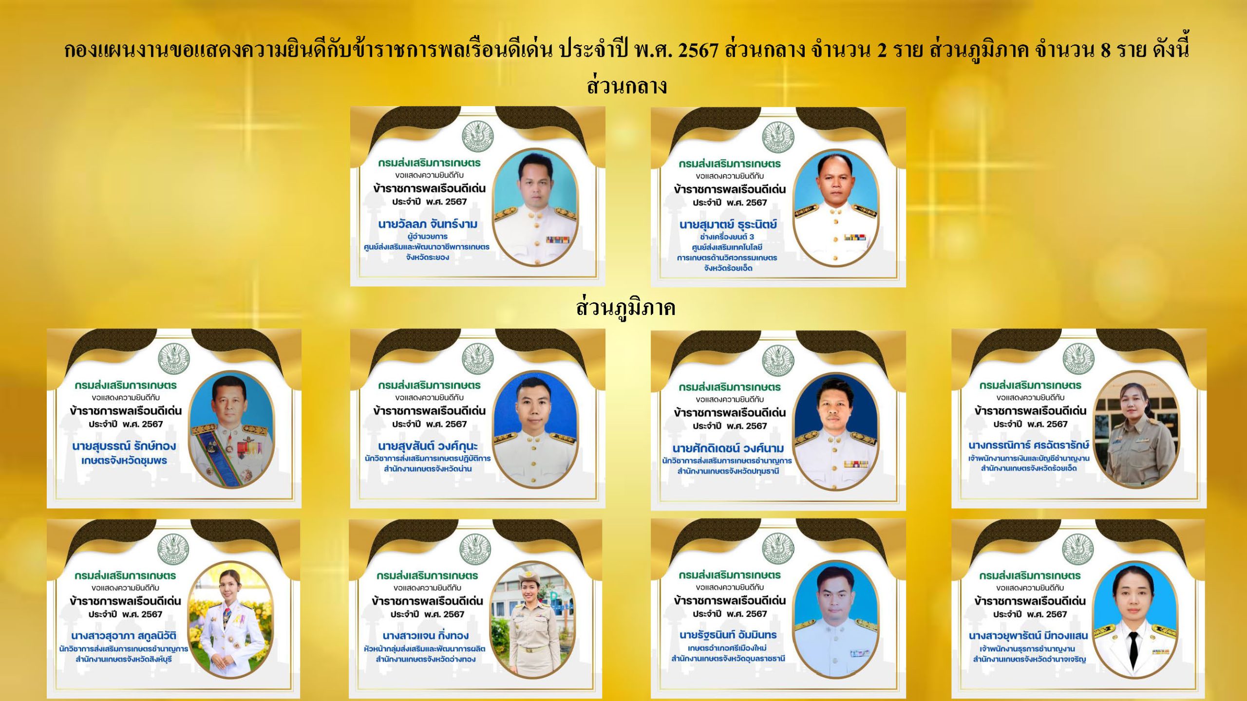 กองแผนงานขอแสดงความยินดีกับข้าราชการพลเรือนดีเด่น ประจำปี พ.ศ. 2567 ส่วนกลาง จำนวน 2 ราย ส่วนภูมิภาค จำนวน 8 ราย ดังนี้By ฝ่ายบริหารทั่วไป / 27 มีนาคม 2025 Post Views: 56
